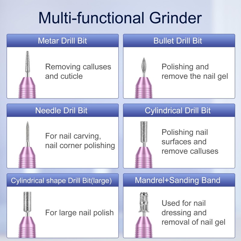 - ❤【Convenient Electric Nail Drill】Come with 1 electric nail drill, 6 different nail drills bits, 16 sanding bands, 1 brush. BICKON electric nail drill set can be used for manicures, pedicures, polishing, shaping, grinding cuticles, removing acrylic/gel nails, or for pet nails beauty. Easily to treat your nails at home!
