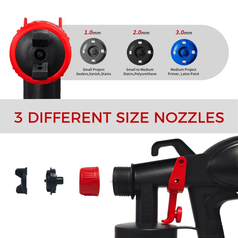 - 3-Nozzle Versatile Spray System: This airless paint sprayer features 1.0mm/2.0mm/3.0mm oxidation-resistant plastic nozzles, handling both water-based (latex, acrylic) and oil-based paints (enamel, varnish) up to 100 Din/s viscosity. The included viscosity cup ensures perfect consistency for furniture, cabinets, and wall projects.