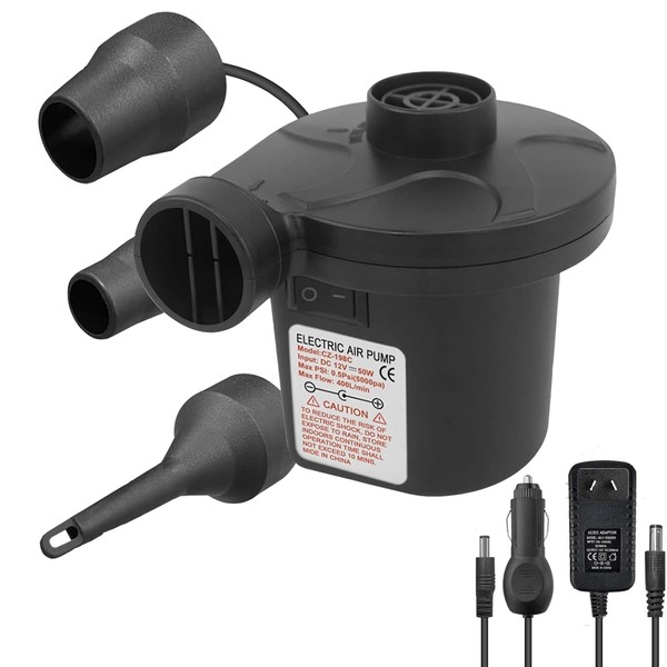 • [ 3 Detachable Nozzles to Choose ] The electric air pumps have three nozzles(large, medium and small)in different sizes that can fit most inflatables,such as air mattress pump, air bed, pool, toy raft boat, inflatable furniture, swimming ring and more