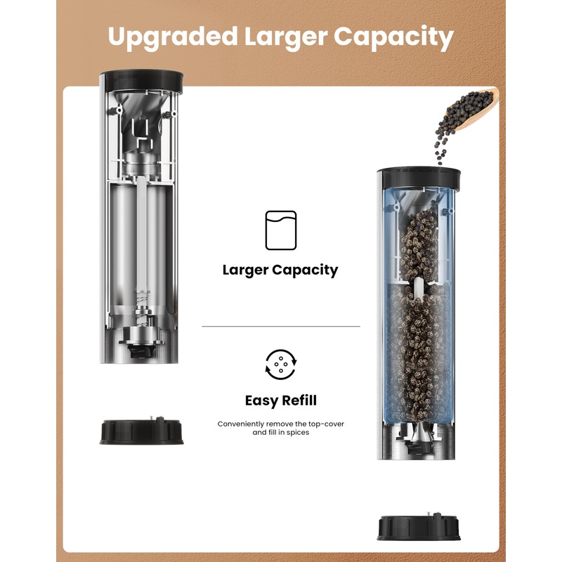 - Upgraded Large Capacity: With an upgraded 3.72Oz large capacity, 40% more volume than others, this salt and pepper grinder set is Designed for heavy use—whether for daily cooking, family gatherings, or summer parties. No frequent refills needed!