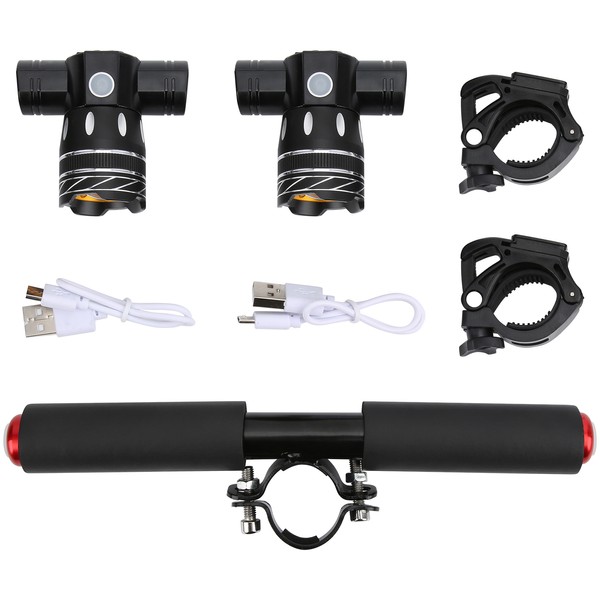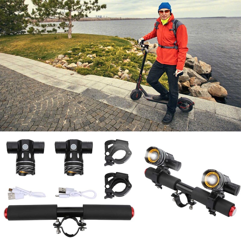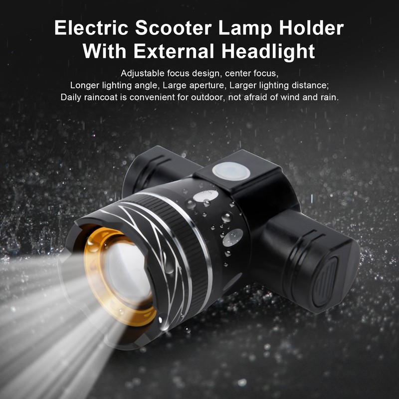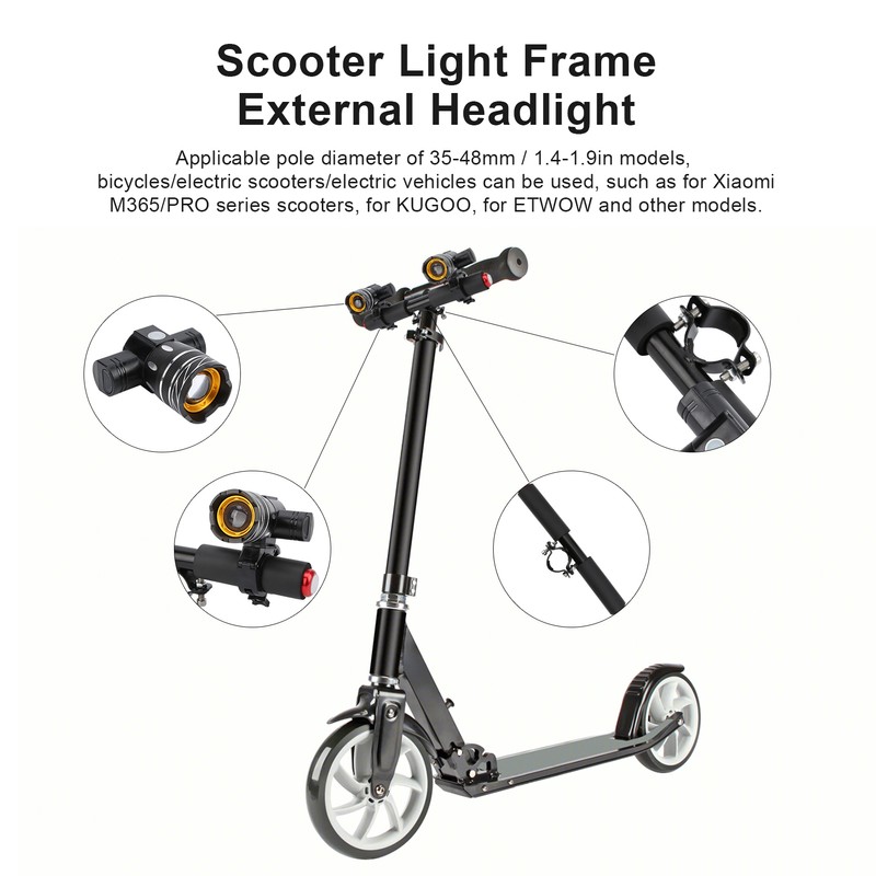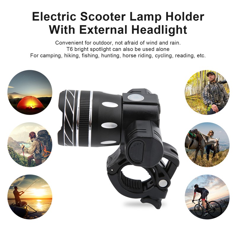 1、Convenient for outdoor, not afraid of wind and rain. T6 bright spotlight can also be used alone for camping, hiking, fishing, hunting, horse riding, cycling, reading, etc. 2、Applicable pole diameter of 35‑48mm / 1.4‑1.9in models, bicycles/electric scooters/electric vehicles can be used, such as for Xiaomi M365/PRO series scooters, for KUGOO, for ETWOW and other models. 3、USB charging can be charged from any USB device, and the battery has a button removal function, and it is very convenient to replace the battery. 4、Adjustable focus design, center focus, longer lighting angle, large aperture, larger lighting distance. 5、Made of high-quality aluminum alloy, durable and comfortable, light and stable in use.