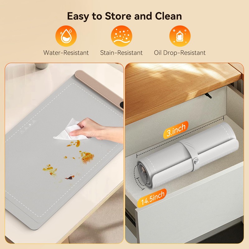 - [Convenient and Reliable Design] Designed with anti-scald edge and heightened non-slip pad, does not hurt the table top. This food warmer tray prioritizes safety and stability during operation. The included silicone strap it easy to roll up and placed in a bag for hassle-free maintenance. Fold and store without worrying about unsightly creases.