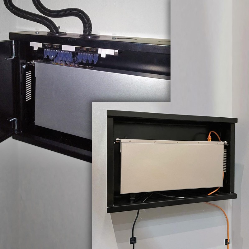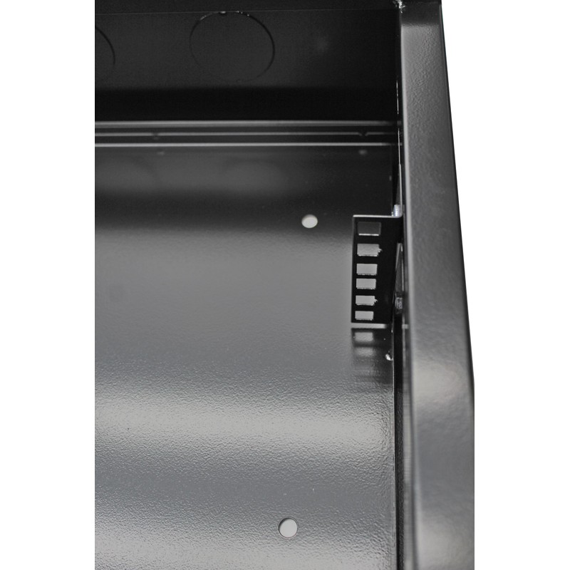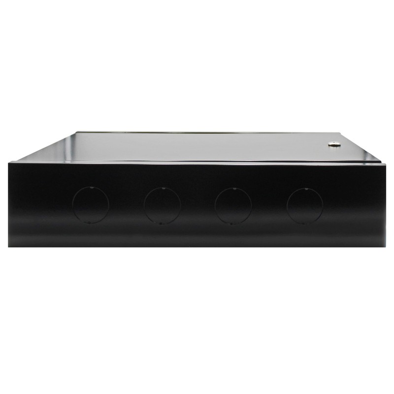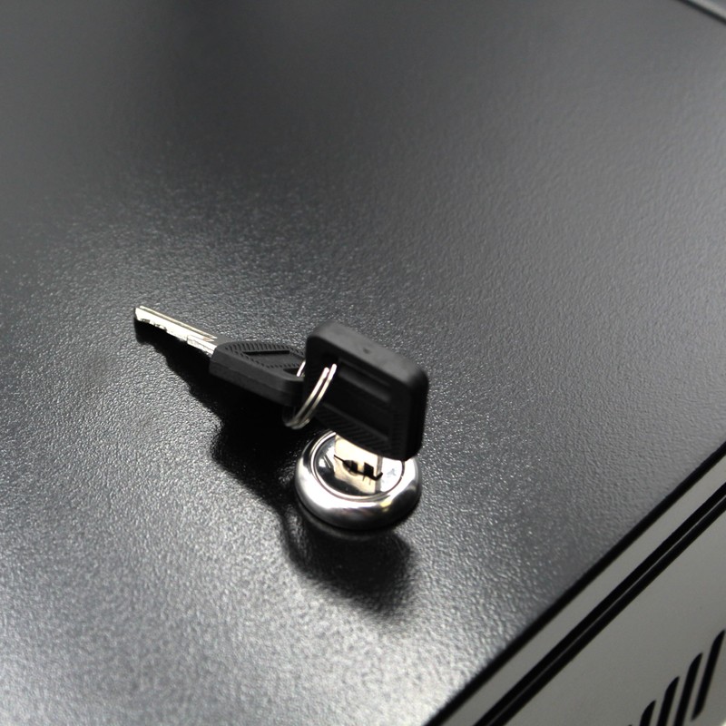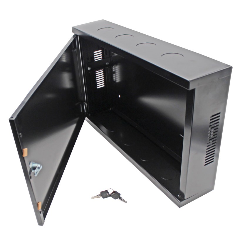 - Solid steel door with a steel frame and key lock; Solid rear panel with mounting holes