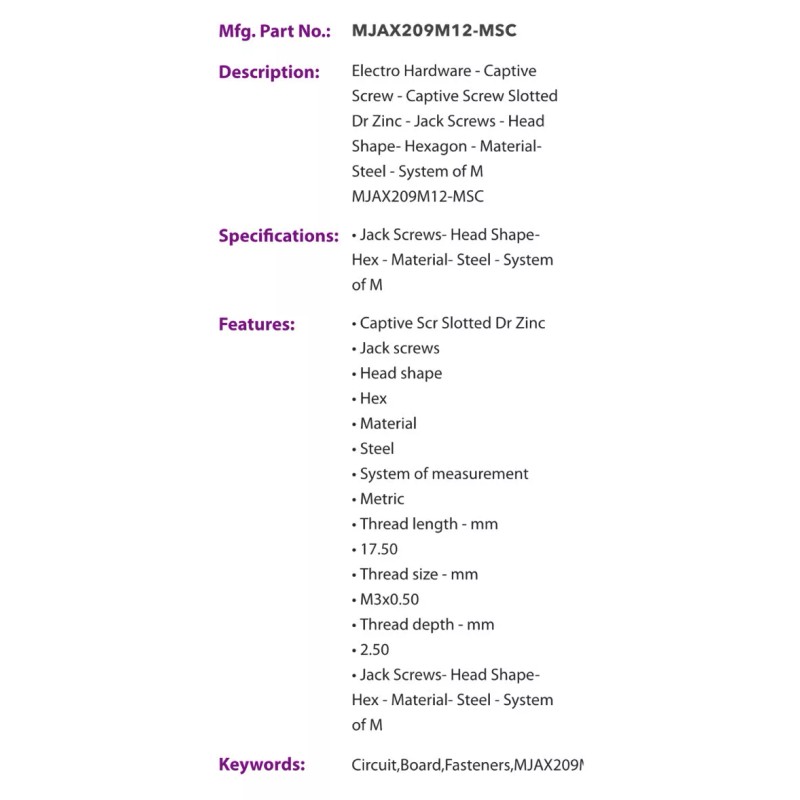 Description: Electro Hardware - Captive Screw - Captive Screw Slotted Dr Zinc - Jack Screws - Head Shape- Hexagon - Material- Steel - System of M MJAX209M12-MSC
