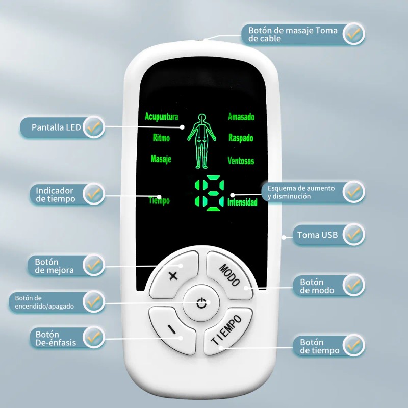 Alivio del Dolor no Invasivo y sin Medicamentos: Este dispositivo ofrece una opción no invasiva y sin medicamentos para aliviar el dolor. Es tu aliado perfecto en casa para aliviar el dolor causado por el ejercicio o las tareas domésticas en los músculos de los hombros, espalda, cuello, brazos y piernas.