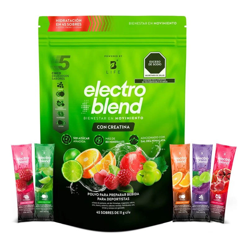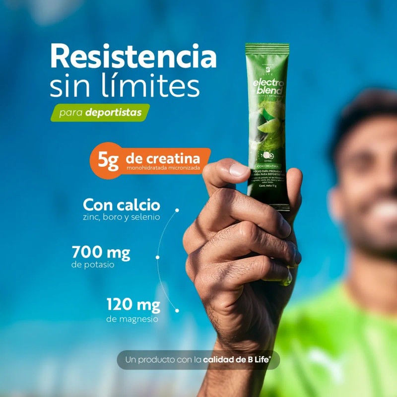 ¡Electroblend + Creatina B Life, resistencia e hidratación para deportistas de verdad! Conoce nuestra nueva formulación de electrolitos con creatina. Cada porción de 11 gramos ofrece 5 g de creatina y más de 80 minerales esenciales con solo 0.40 kcal.