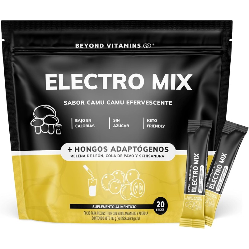 Electrolitos Sin Azúcar En Polvo Beyond Vitamins | Hidratación Baja en Calorías, apto dieta Keto | Sabor fresco y vibrante para una recuperación increíble | 20 sticks individuales (20 Sticks, Camu Camu Efervescente (Con Hongos))