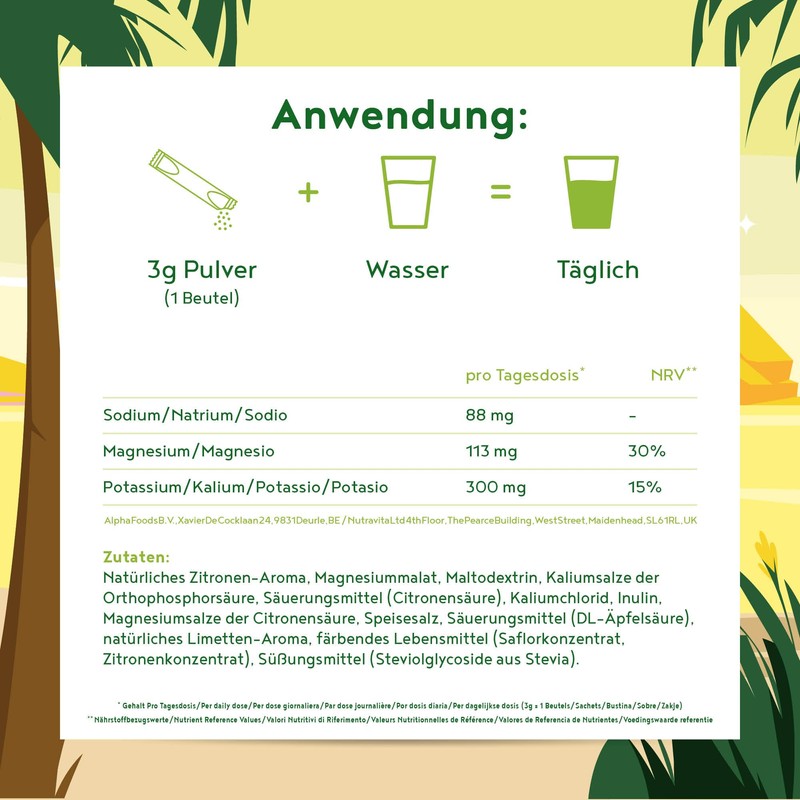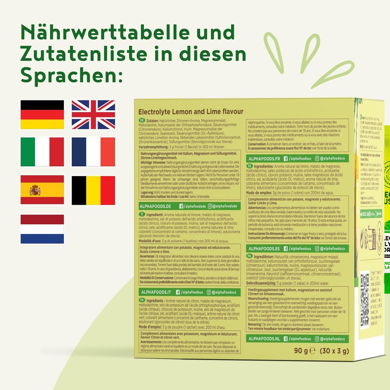 - Cramps, headaches, fatigue, lack of concentration, sleep disorders or even cravings can indicate a disturbed electrolyte balance. Alpha Foods electrolytes therefore contain the naturally occurring electrolytes sodium, magnesium and potassium and come in 30 portions of 6 g each. Since the human body cannot produce potassium and magnesium itself, potassium and magnesium needs must be met through the food.