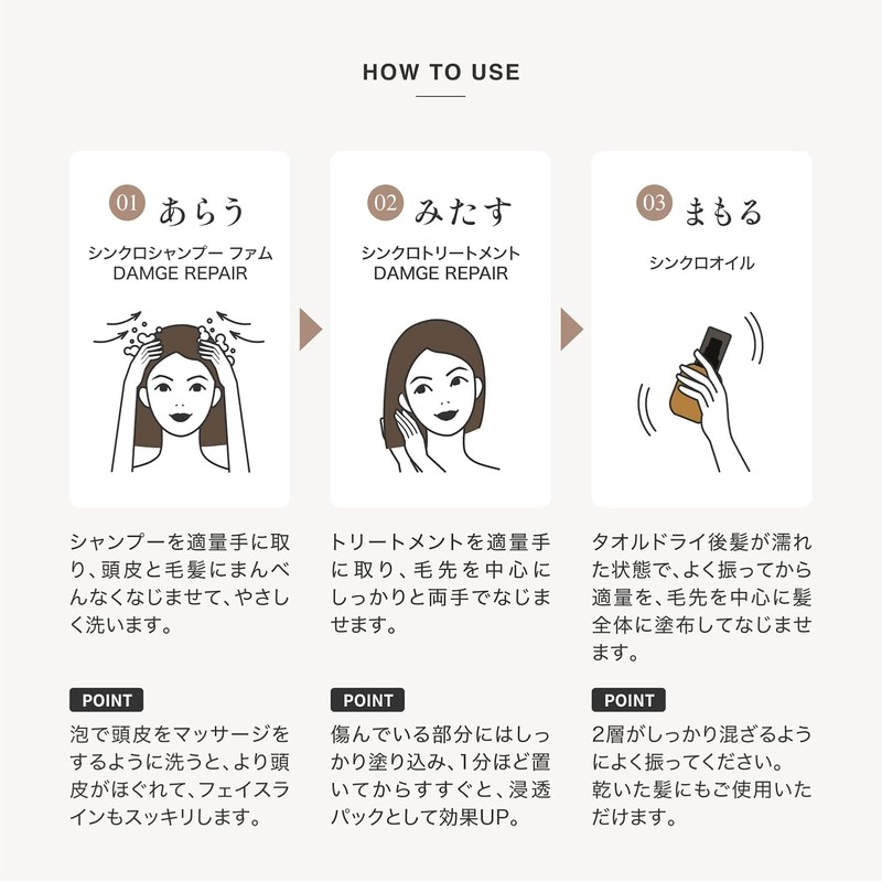 - [How to use synchronous oil] Take an appropriate amount of hand and apply the entire hair to the center of the hair. Use it wet after towel dry to protect your hair from heat damage caused by dryer. Shake well before using to ensure that active electronic water and beauty oils are mixed together. You can also apply it after drying to give it a more natural sheen. "