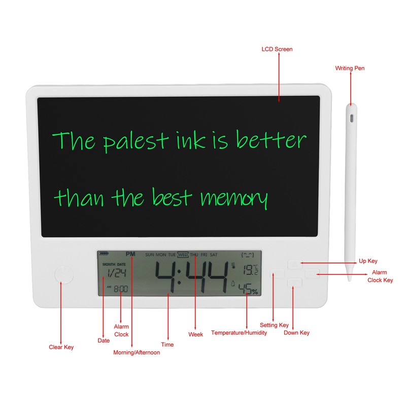 1、LCD Display Screen: This electronic calendar writing board adopts a high definition LCD display screen, which presents brightly colored images and text, clear and intuitive. 2、Multifunctional Design: This device integrates a calendar, electronic clock, and writing board to meet various needs of family life or office, which is convenient and practical. 3、Writing and Recording: This electronic writing pad is equipped with a pen, supports handwriting input, making it easy to record important matters, make notes, and create graffiti. 4、Battery Powered: This electronic calendar is equipped with built in battery, 200mAh capacity to ensure long term use, low energy consumption design to extend its service life. 5、Simple and Portable: This electronic calendar writing board is lightweight and portable, convenient for use, storage, and carrying, suitable for household, office, and travel use.
