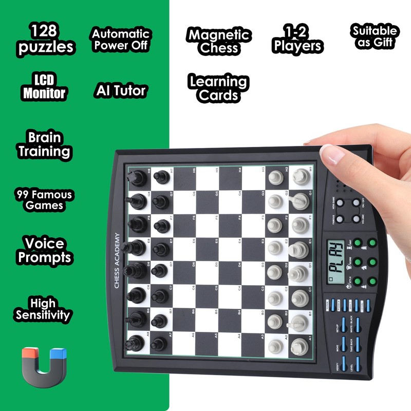 - Chess Learning Features: 128 Pre-set puzzles with diagrams / solutions book included, fun voice prompts and score system during endgame practice. 99 famous games for whole game replay with voice announcement of piece type and coordinates (make sure TUTOR function is on). 5 mini-chess games for novices to learn each pieces in turn.