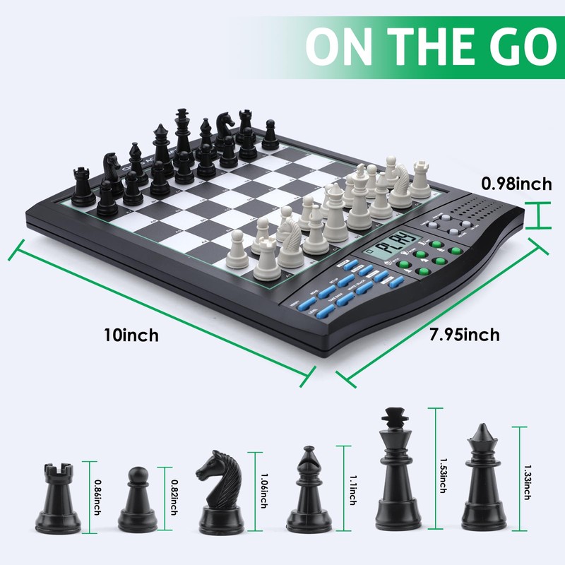 - Smart Chess Board: Big LCD digits EASY TO SEE, HIGH SENSITIVE chess board with better move input EASY TO MAKE MOVES - a light touch on squares or top of pieces. Magnetic Chess Set for easy standing in place. Auto Power-off and saving function keep you playing games for hours.