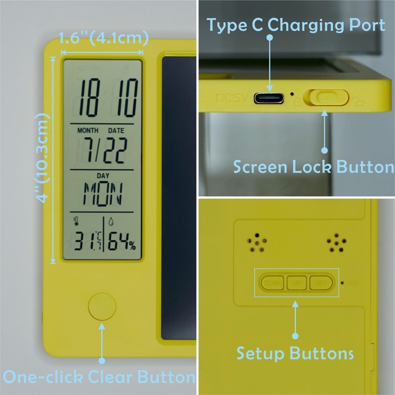 Electronic Digital Calendar with 9.5 inches LCD Writing Tablet Memo Board and Stylus, Time&Day&Temperature&Humidity Display for Office Student Home Work, Yellow