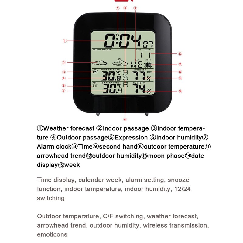 Functions: Indoor and outdoor temperature humidity, Time display, Weather forecast, Alarm clock, Week day month display, Moon phase, Trend Arrowhead, Maximum minimum value, Facial expression reminder, Alarm clock (one-click SNZ, snooze for 5 minutes), Wireless transmission, RF sensor technology, can support three outdoor sensors.