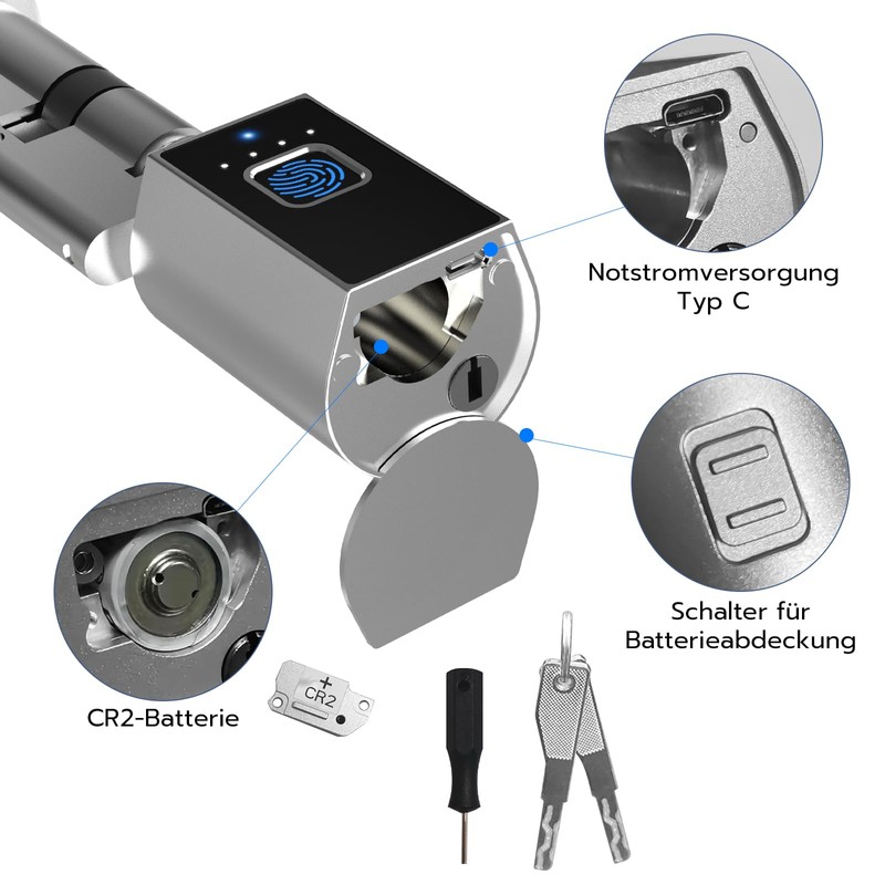 Electronic Door Lock 60 mm (30/30) with Key Fingerprint Bluetooth App Remote Authorisation - Suitable for Doors Most EU - Door Locks DIY Assembly Supports iOS Watch