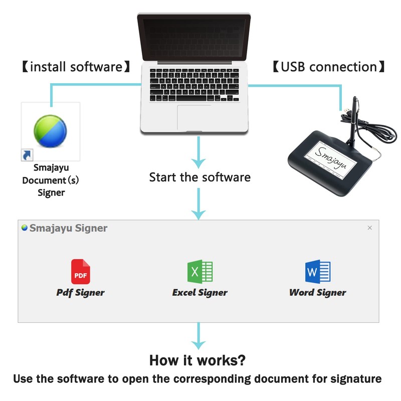 - 【How to sign documents】Install “ SMAJAYU document(s) Signer” on computer, run this app and create certification for first installation which for signature encryption and safety. Then insert Signature pad by USB and open files to start sign.