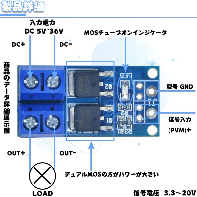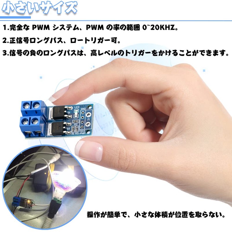 - Perfectly compatible with wide voltage, PWM and easy to control large power equipment. This product uses dual MOS parallel active output, with lower internal resistance, higher current and stronger power. 15 A, 400 W at room temperature and meets the use of many devices
