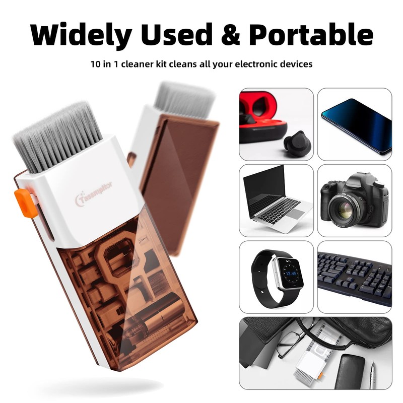 - DEEP CLEAN YOUR DEVICE The electronics cleaner kit can effectively deep clean all your electronic devices such as mobile phones, tablets, TVs, etc. It comes with retractable large brush, polishing cleaning cloth X 2, keycap puller, metal pen tip, flocking sponge, thin soft brush, soft plastic lens cleaning pen, 5 replacing cloth , large cleaning microfiber cloth. It's compact so you can keep one in a drawer, one in the car or in your bag