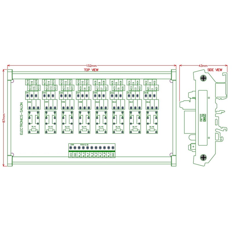 DIN Rail Mount 8 Channel DPDT Signal Relay Interface Module, DC 5V Version. RY5W-K high quality signal relays, LED indicator for each relay channel. Darlington transistors circuit driving relay, improve the reliability of action. DIN rail mount carrier: High quality Taiwan DINKLE fireproof nylon material DIN rail mount carrier (not China low quality carrier), can support width 35mm / 32mm / 15mm rail. FR-4 fiber glass dual layers PCB. Pitch 3.81mm / 0.15" screw terminal block, wire range 26-16AWG, strip length 5mm / 0.2", Metric M2 slotted screw. External dimensions: 152 x 87 x 43mm(L x W x H).