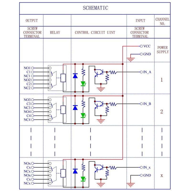 Relay Spec: Relay Part Number: RY5W-K. Contact Material: Gold Overlay Silver-Palladium. Contact Rating: 120VAC / 0.5A, 24VDC / 1A. Wire connection and PCB size: VCC: Power supply input. GND: Power supply ground and control signal ground. IN-X: Control signal input, Low: relay not action, High: relay action. COM / NO / NC: Control signal state low, the relay OFF, COM - NO disconnected, COM - NC connected. Control signal stage high, the relay ON, COM - NO connected, COM - NC disconnected.