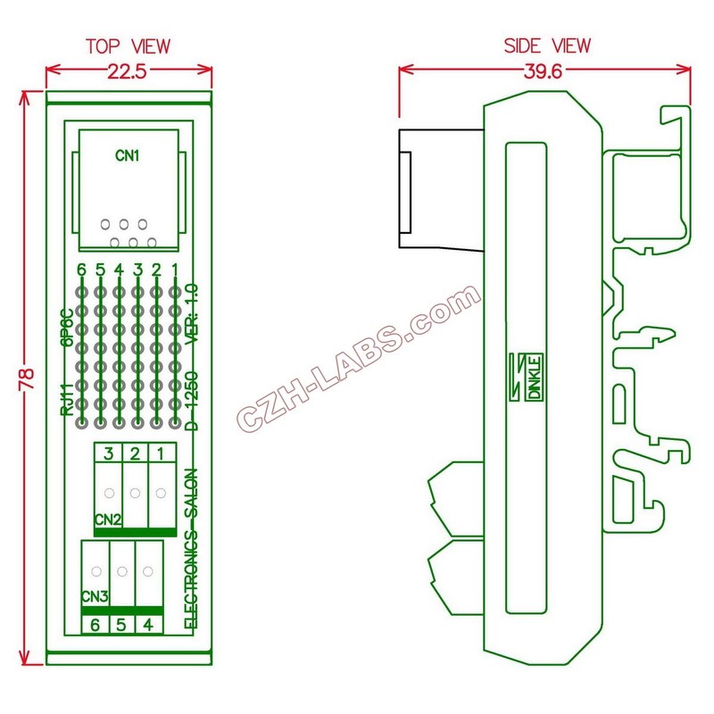 Slim DIN Rail Mount RJ11/RJ12 6P6C Breakout Board Interface Module. 6P6C vertical jack. Solder connection holes 8 per line, supports addition of 0.1" pin headers. FR-4 fiber glass PCB, dual copper layers. Rated voltage: 80V. Rated current: 1A / per pin. Operating Temperature: -20ºC to 70ºC Terminal block: Pin pitch 3.5mm/0.138", Wire range 28 ~ 16 AWG / 1mm square. Strip length 5mm. Screws - M2, steel, Cr3+ Zn plated. Pin header and Cage - Brass. High quality Taiwan DINKLE fireproof nylon material DIN rail mount carrier (not China low quality carrier), can support width 35mm, 25mm or 15mm rail.