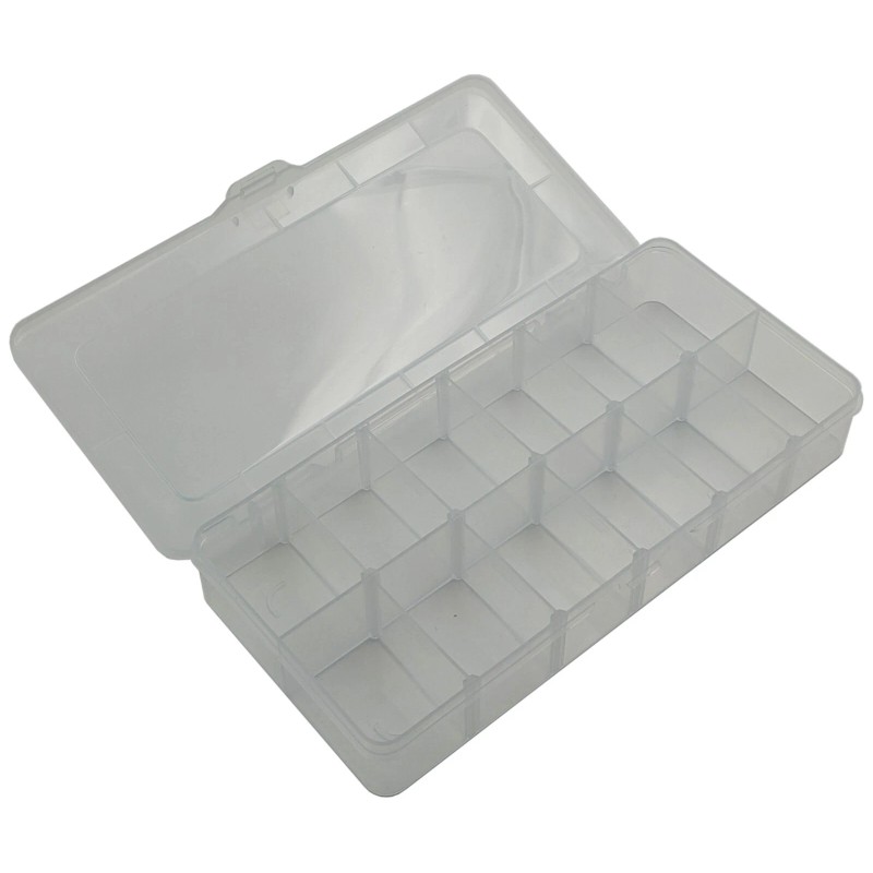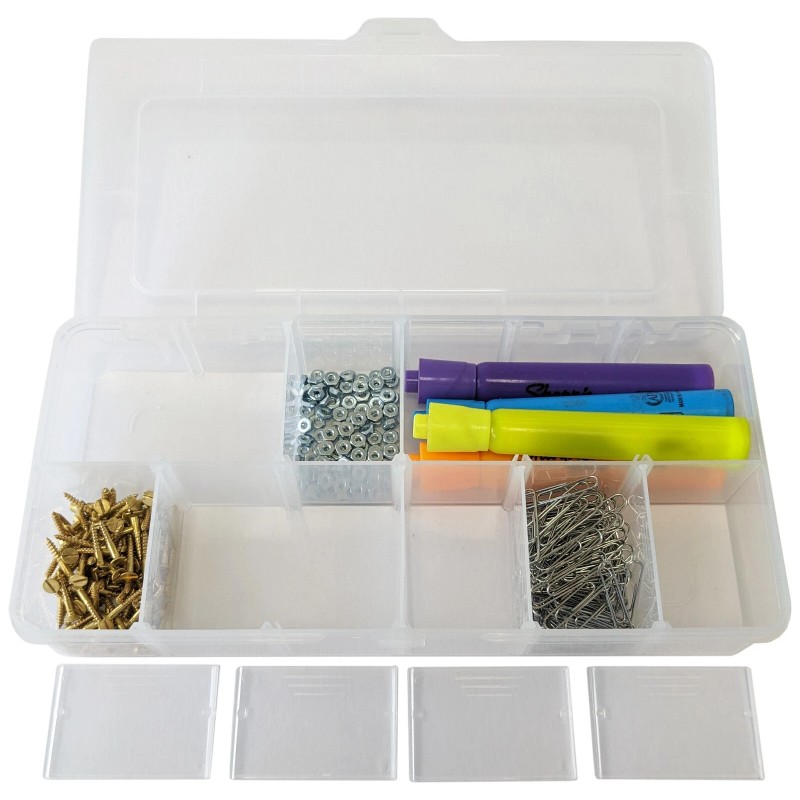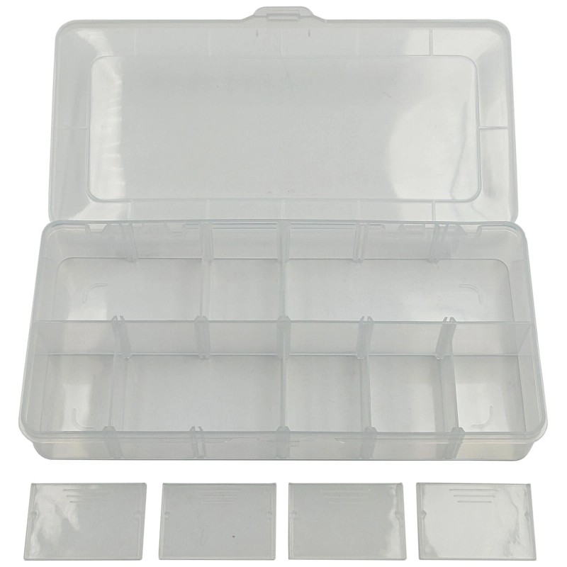 5 Pack. This slotted Polypropylene storage box is perfect for holding screws, electrical components, and other small parts for tasks such as phone or tablet repairs, hobby modeling, and crafting. Portable size 10" x 4⅞" x 1⅝" with snap-to-close lid that is clear so you can see if the part you need is in the case without opening it. Includes 10 removable divider pieces that can be inserted into the 2 compartment trays to accommodate different sized items. If all 10 dividers are inserted, there will be a total of 12 slots.