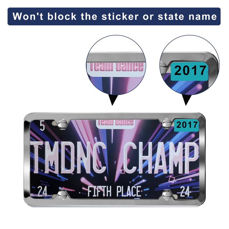 - 【Narrow Edge Frame】Our license plate frames are designed with narrow edge that won't block the registration sticker or cover the state name on the license plate. To ensure safe and legal driving on the streets. So you can drive on the streets safely and legally.