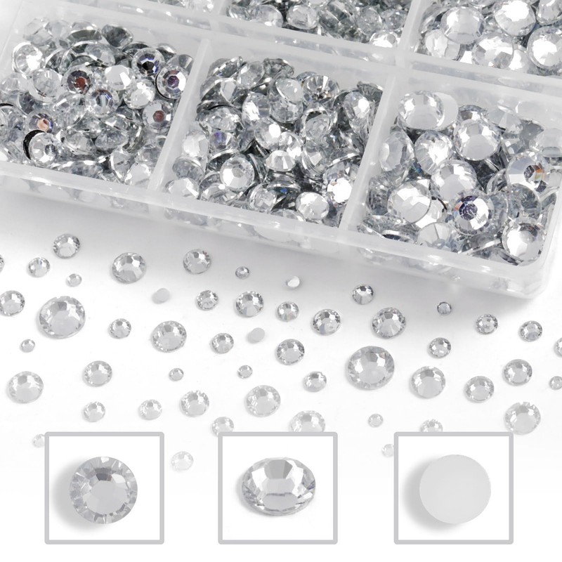 - This set of flatback rhinestones comes in 5 sizes, 2mm-5300 pcs,3mm-1400 pcs,4mm-740 pcs,5mm-800 pcs,6mm-160 pcs, and is packed in two plastic boxes to store various sizes separately.