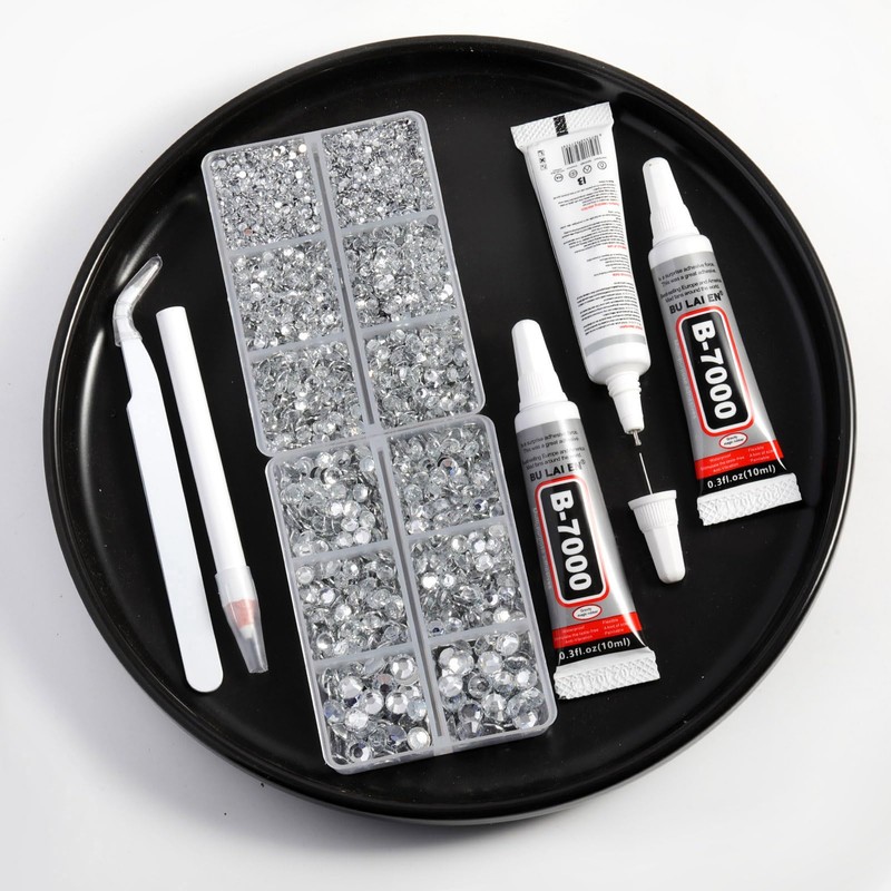 - The B7000 rhinestone glue in the set is a multi-purpose bonding glue suitable for materials such as cloth, leather, paper, ceramic and other materials.