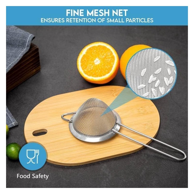 • ROBUST STAINLESS STEEL CRAFTSMANSHIP: Crafted from enduring stainless steel, these strainers are not only built to last but also add a touch of sophistication to your kitchen. Ultra fine mesh strainer their sleek mirror finish exudes elegance.
