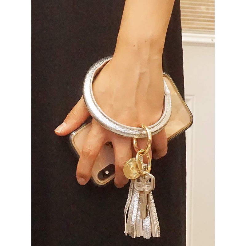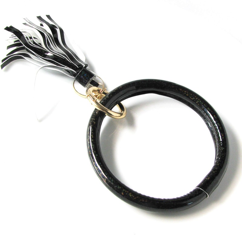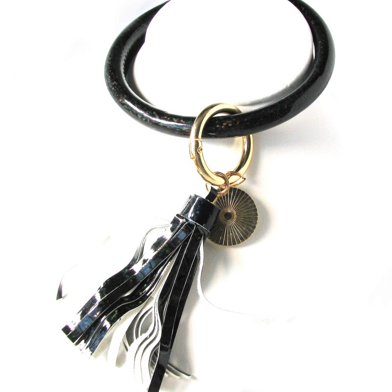 Elegance with Flair Black Glitter Leatherette Round Enamel Tassel Key Ring