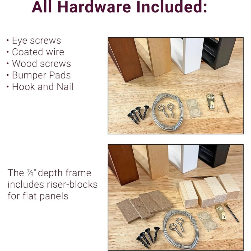 - Includes all necessary hardware: screws, hanging wire, bumper pads, hanging hook, and nail for effortless installation.