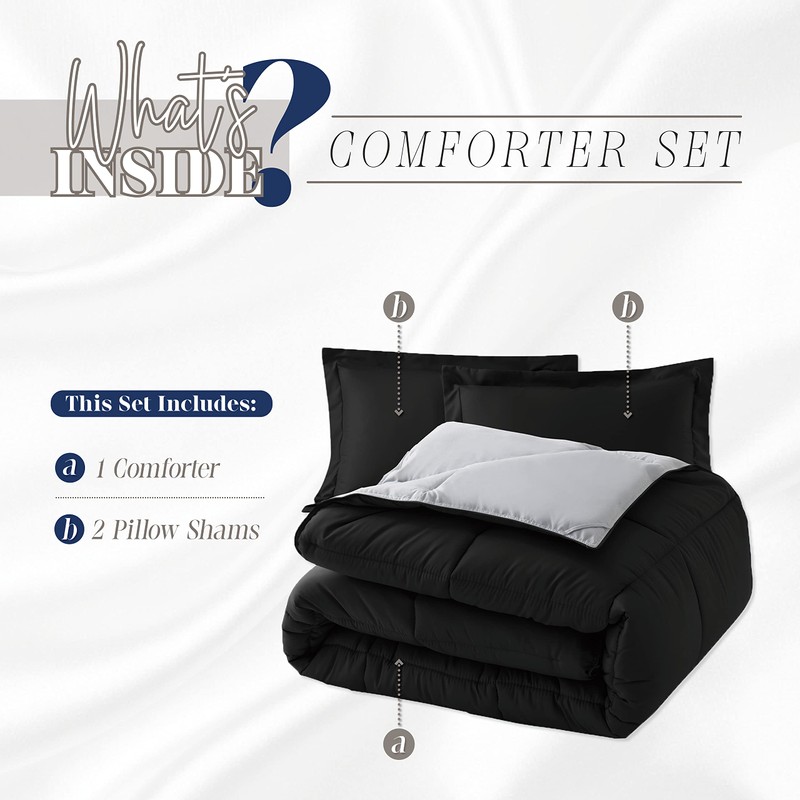 Elegant Comfort 3-Piece Reversible Comforter Set, All Season Cozy, Soft Down Alternative, Quilted - Box Stitched - Duvet Insert with 4 Corner Tabs, Comforter with Shams, King, Black/Silver