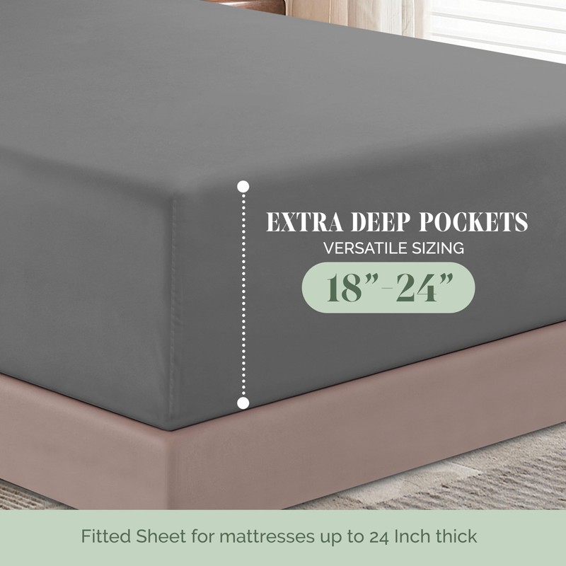 - ENHANCED DEEP POCKET FIT: Our fitted sheet is designed with extra-deep pockets to accommodate mattresses up to 24 inches thick, making it ideal for air mattresses, foam toppers, and other high-profile bedding. The all-around sewn-in elastic provides an easy, hassle-free fit that stays securely in place all night long.