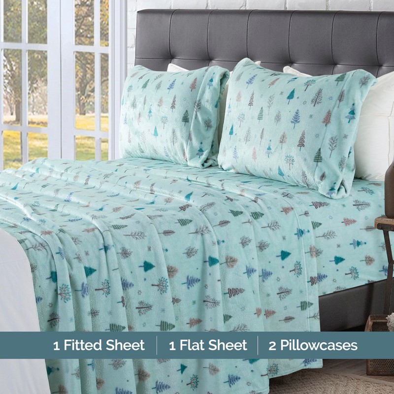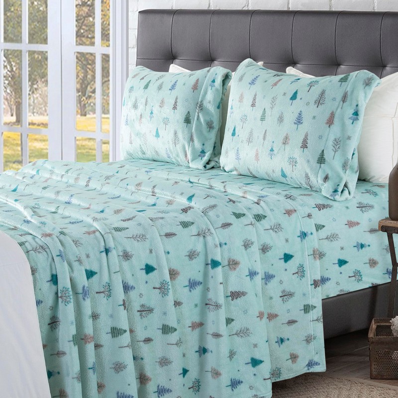 Elegant Comfort Luxuriously Soft 4-Piece Holiday Velvet Plush Flannel Sheet Set - Premium Quality - Cozy Warm, Christmas Fuzzy Velvet Flannel Fleece Deep Pocket Sheet Set - King, Mint Pine Trees