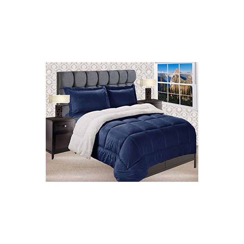 Elegant Comfort Premium Quality Heavy Weight Micromink Sherpa-Backing Reversible Down Alternative Micro-Suede 3-Piece Comforter Set, Queen, Navy Blue
