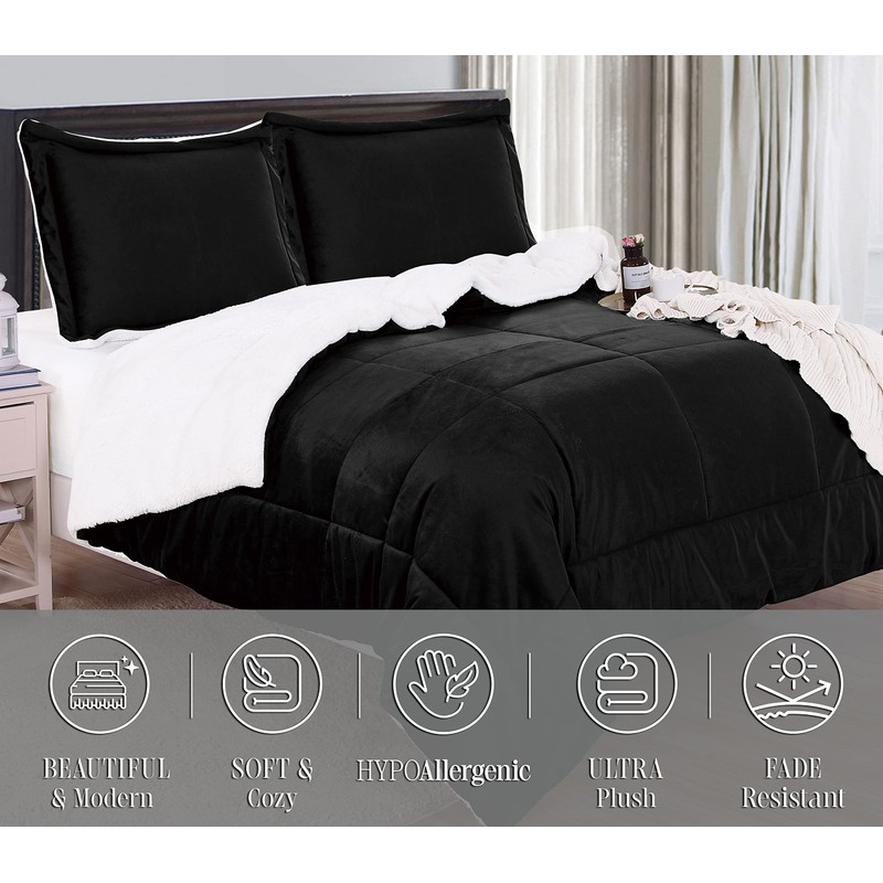 Elegant Comfort Super Soft Sherpa Comforter 3-Piece Set Premium Quality, Heavy Weight Reversible Down Alternative Micro-Suede, Sherpa Comforter, Cal King, Black Satin
