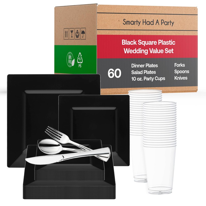 Elegant Disposable Plastic Dinnerware Set, Heavy Duty Plastic Plates (Black, Wedding Value Set (60 Guests))