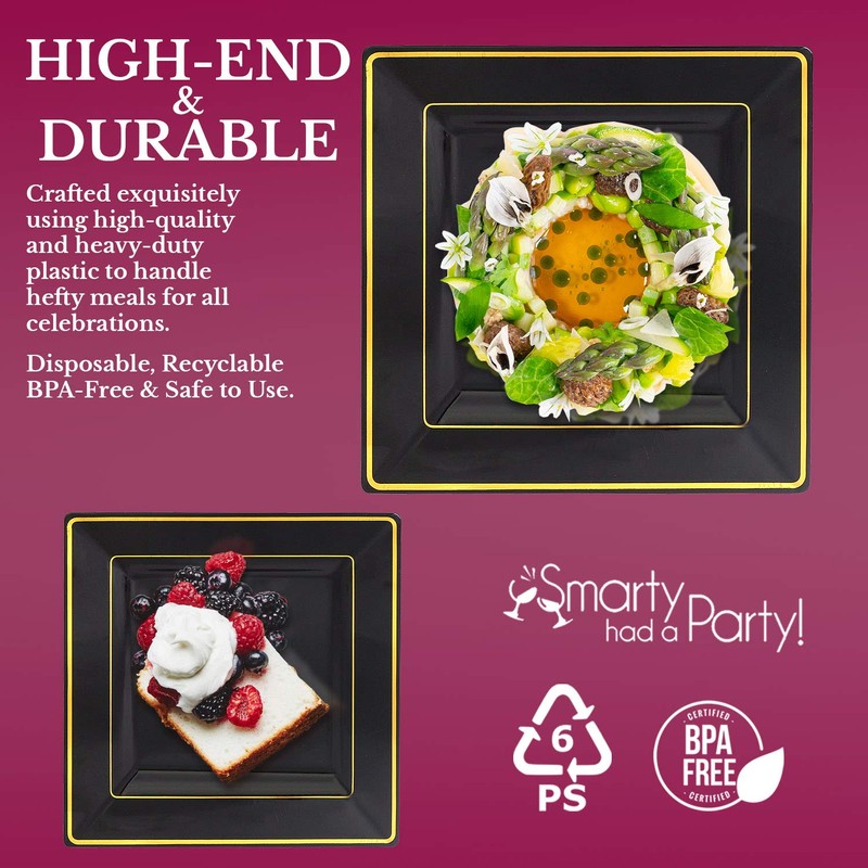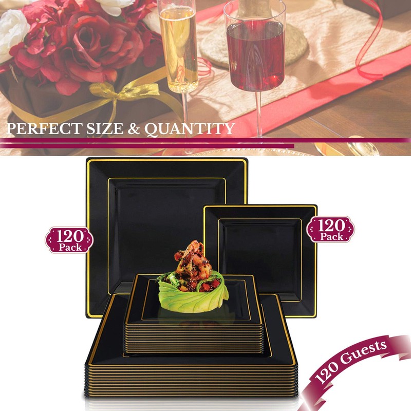 Elegant Disposable Plastic Heavy Duty Dinnerware Sets, Square Plastic Plates, For Wedding, Birthday & All Occasions (Black with Gold, Combo Plate Set (120 Guests))