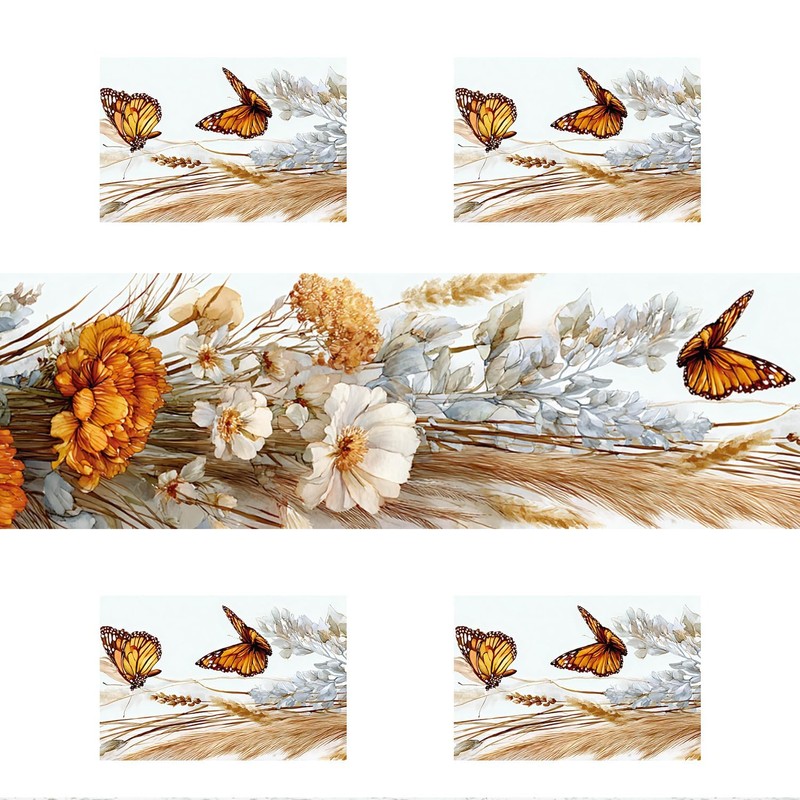 - Charming Fall Artwork – Features detailed watercolor-style orange and white flowers, wheat, blue-gray foliage, and butterflies—rich in seasonal character.