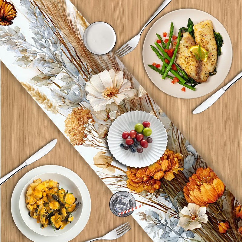 Bring the serene beauty of autumn to your table with this Elegant Floral & Butterfly Table Runner and Placemats Set. The runner showcases a lush arrangement of orange chrysanthemums, creamy white blooms, soft blue leaves, and golden wheat stalks, artistically interwoven in a rustic watercolor style.