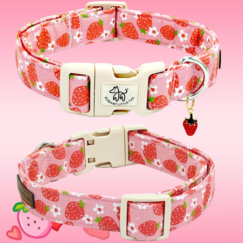 Elegant little tail Dog Collar, Strawberry Pattern Pet Collar Pink Durable Spring Female Spring Collar Adjustable Cotton Pet Collar with Quick Release Buckle for Medium Dogs