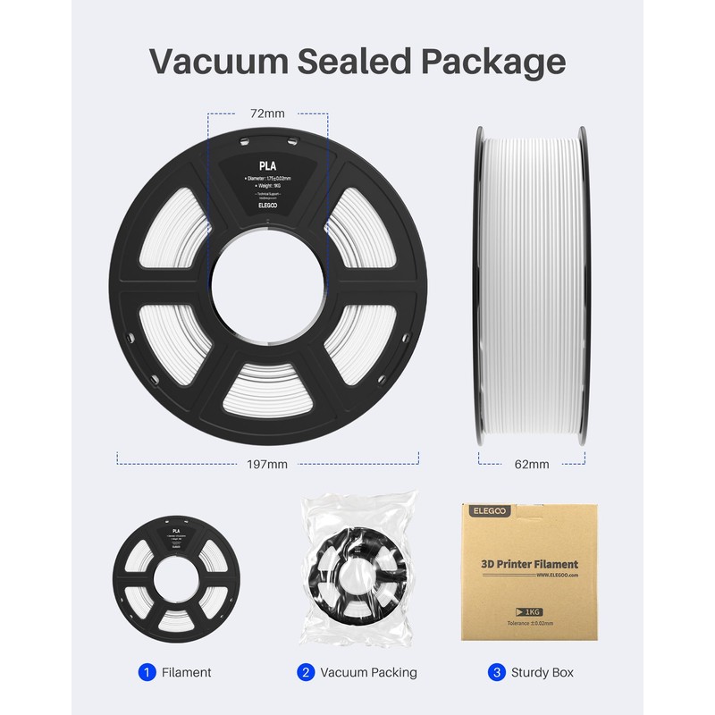 • NO CLOGGING & NO BUBBLE: ELEGOO PLA Filament is complete dried before packaging and vacuum sealed well to protect the filament from moisture, no clogging and bubbling problems