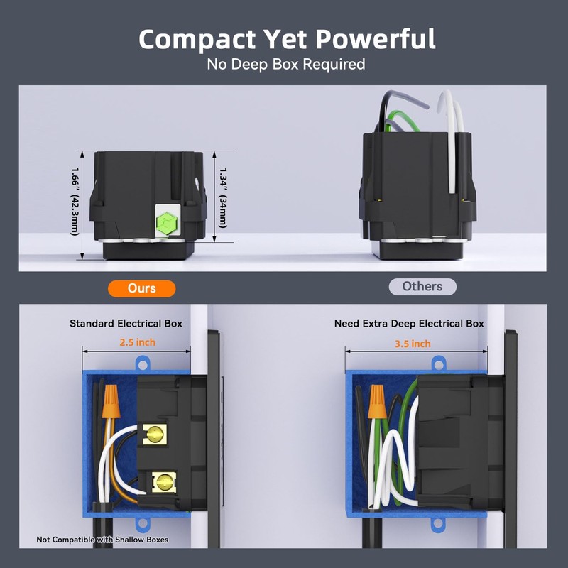 - Diseño compacto, sin necesidad de una caja eléctrica profunda: la estructura compacta se adapta a cajas eléctricas estándar, lo que facilita la instalación sin necesidad de una caja más profunda. Está diseñado para reemplazar fácilmente los enchufes existentes, proporcionando más espacio para el cableado.