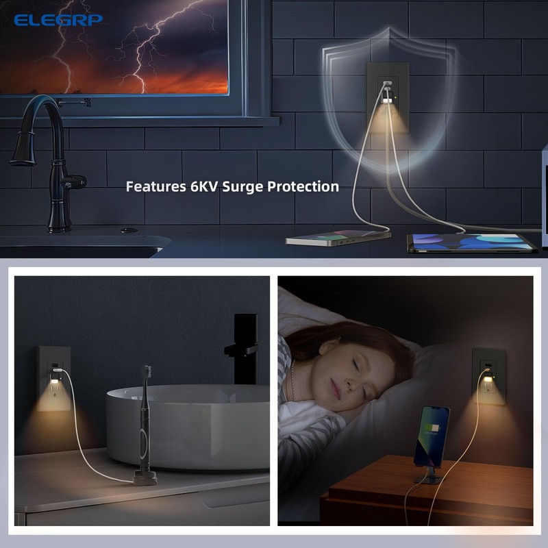 ELEGRP - Toma de corriente GFCI con puertos USB y luz nocturna, combinación GFCI de 15 amperios con puertos USB, salida USB GFCI resistente a manipulaciones con luz nocturna, placa de pared incluida,