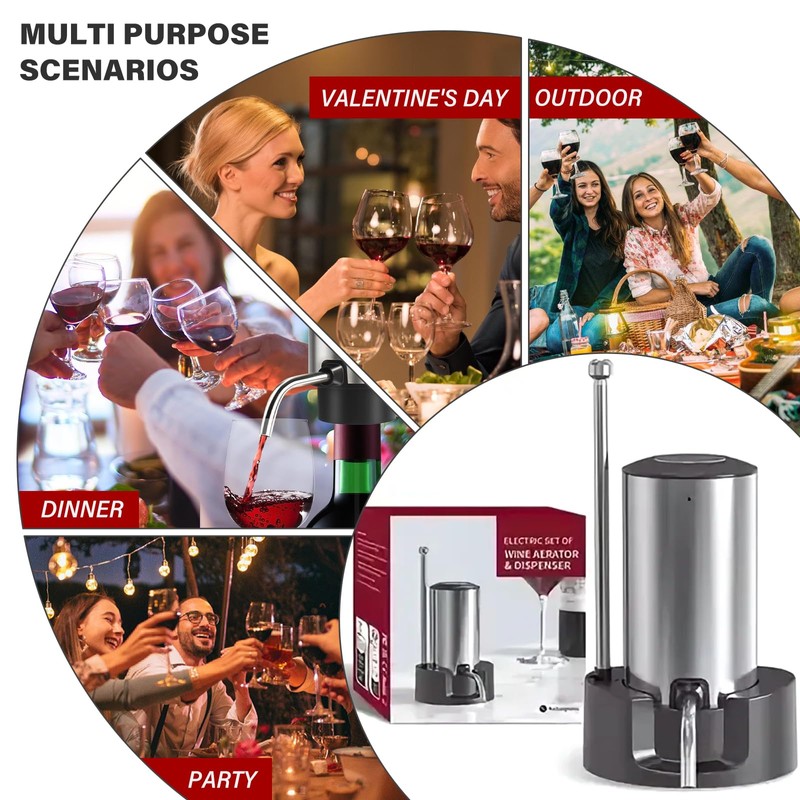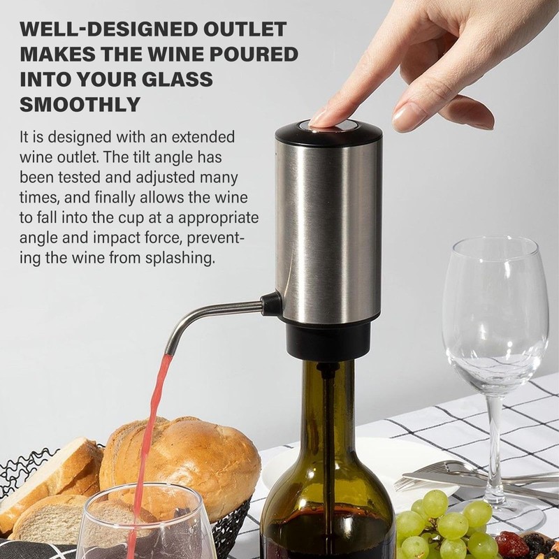 1. Der Elektrischer Wein Dekanter besteht aus Edelstahl.Mit nur einem einfachen Knopfdruck wird der perfekt belüftete Wein direkt in Ihr Glas geleitet.