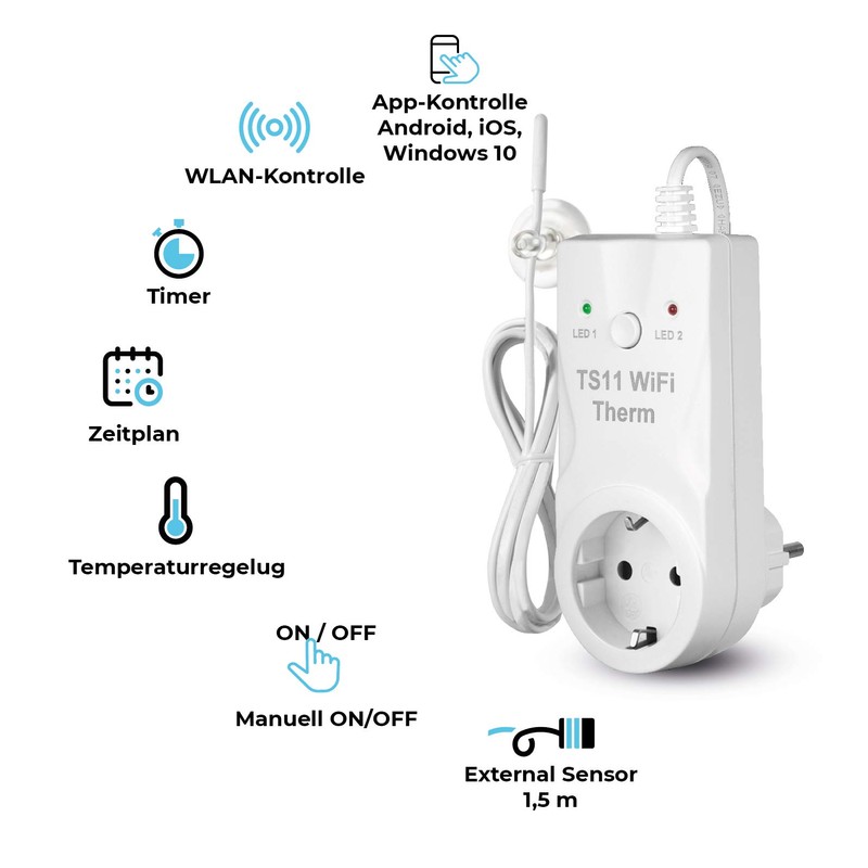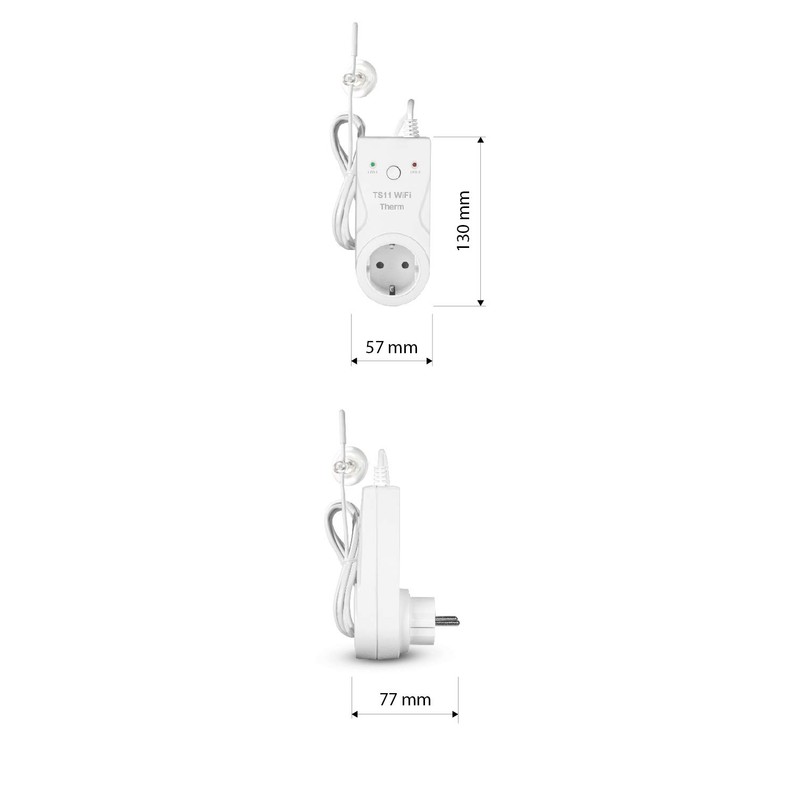 - WiFi thermostat intermediate socket, TS11 WiFi Therm is a WLAN-enabled plug thermostat for electric heaters. The intuitive app turns your smartphone into a remote control and allows you to easily control your heating system from anywhere in the world. Relay output maximum 16A. The application in German is available for Android, iOS.