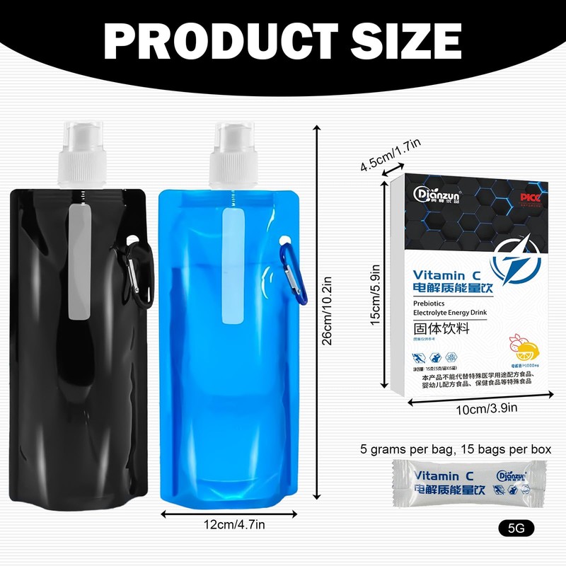 - Lieferumfang: Sie eine Packung elektrolyte pulver (15 Streifen) mit erhalten zwei Trinkflaschen Faltbar (schwarz und blau) . lösen Sie Electrolyteseinen Beutel in 400–500 ml Wasser auf, um den Flüssigkeitshaushalt aufzufüllen und dem Körper Elektrolyte zuzuführen