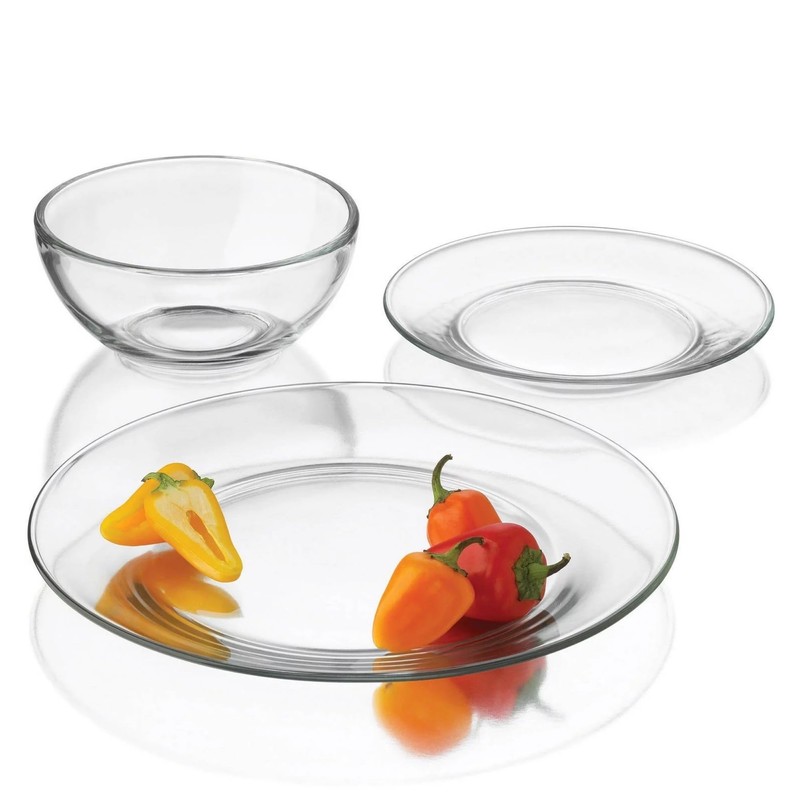 • Elemental yet sleak dinnerware set made out of thick and durable clear glass.