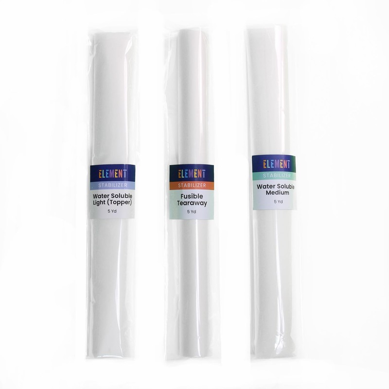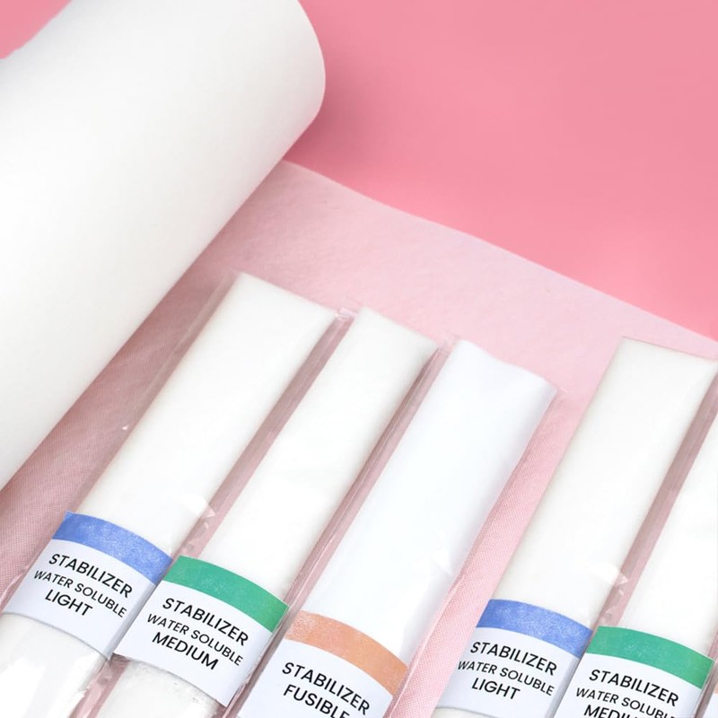 - Stabilizers included: Light Weight Water Soluble, Medium Weight Water Soluble and Medium Weight Fusible Tear Away